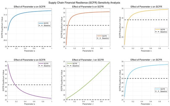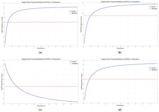 We next examine the non-ideal case using the baseline parameters, i.e., , , , , , , , and . The calculated initial financial resilience is 29. Subsequently, the sensitivity analysis proceeds in four phases: varying the quarantine rate b from 0 to 1; adjusting the recovery rate c from 0 to 1; modifying immunity loss e from 0 to 1; and changing the quarantine release rate from 0 to 1. Each parameter variation occurs with others at baseline values, allowing for the isolation of individual effects on the equilibrium SCFR.