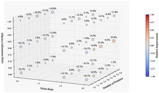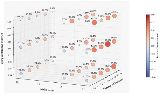 Figure 3 illustrates the relative improvement achieved by our method with XGBoost. Compared to the simple linear regression model, our approach with XGBoost demonstrates stronger performance gains. The improvement ratio remains around 20– in most cases. Although there are a few scenarios where the performance slightly declines, the drop is generally limited to around . Notably, our method achieves substantial improvement—up to —when the number of features is large and the proportion of informative features is high. This highlights the advantage of our approach in effectively capturing and leveraging core informative features in the data. These results underscore the robustness of our method across more complex model structures. Generally, the improvement ratio of our method reaches .