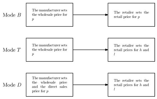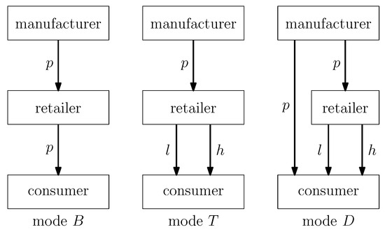 We consider that the manufacturer chooses its sales channel: selling probabilistic goods through a direct channel to customers or an indirect channel provided by the retailer, where probabilistic goods are supplied to the retailer. In certain retail settings, probabilistic goods may sometimes be unsealed by the retailer at the point of sale to explicitly offer high-quality and low-quality items with complete transparency. Therefore, we primarily explore three distinct modes: There is the based mode, denoted as mode B, where the manufacturer supplies the probabilistic goods, and the retailer sells the probabilistic goods only. On the other hand, there is mode T, in which the manufacturer supplies probabilistic goods to the retailer, who then unseals the exact products (either high-quality or low-quality products) to sell them with complete transparency. In this mode, as the retailer effectively eliminates the probabilistic goods from the market, this is formally supported by Lemma 1, which demonstrates that even if the retailer offers probabilistic goods alongside the explicitly high-quality and low-quality products, the demand for the probabilistic goods at equilibrium is zero. This occurs because consumers prefer certainty. When unsealed products are available, they will always choose the exact product matching their willingness-to-pay value, thus reducing the demand for probabilistic goods in such market conditions. Therefore, the inefficacy of probabilistic goods in mode T is when unsealed high-quality and low-quality products are available. In mode D, a dual-channel strategy takes place, where the manufacturer directly sells probabilistic goods, while the retailer offers the revealed products. Under mode D, the strategic coordination between the manufacturer and the retailer is modeled as a sequential Stackelberg game: The manufacturer commits to a pricing policy by simultaneously specifying the wholesale price and the retail price of product p. The retailer then optimizes its pricing response based on the manufacturer’s decisions. This sequential structure ensures that the manufacturer’s pricing decisions account for the retailer’s downstream reaction, while the retailer adjusts pricing to maximize its own profit given the manufacturer’s strategy. The three modes are shown in Figure 1.