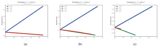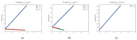 - Case 1:We have the profit functions asandThen, we have the Hessian H aswe have ; then,and also, . Therefore, we have that the is negative definite. Taking the first-order derivatives to be zero, we haveand we obtainNext, inserting , , and into Equation (A23), we have , and then maximizing with respect to , we haveTherefore, we haveSubstitute the values , , and for the demands, we haveSimilarly, we have the profitsand