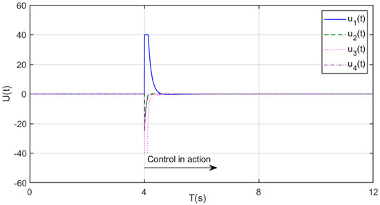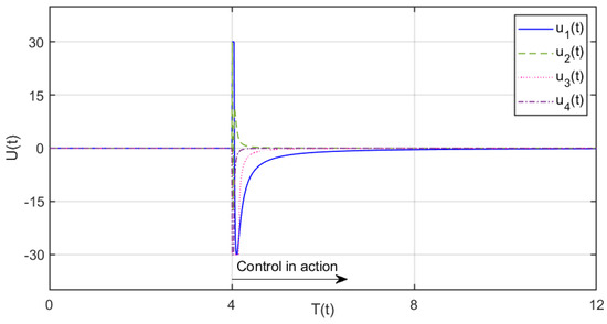Time-domain representation of the control input (30) applied to the FO 4−wing CS (11) for .