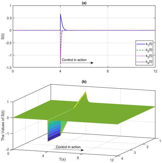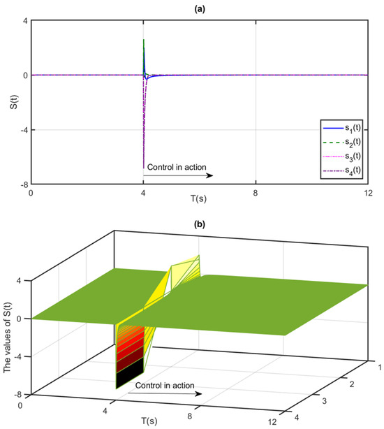Moreover, Figure 9a,b present the time response of the sliding surface (19) through a function plot and a surface plot, respectively. Figure 9a indicates that all parameters of the sliding surface (19) converge to the origin without any chattering. Figure 9b further confirms that the implementation of this approach results in a stable sliding surface, reinforcing the robustness of the control method.