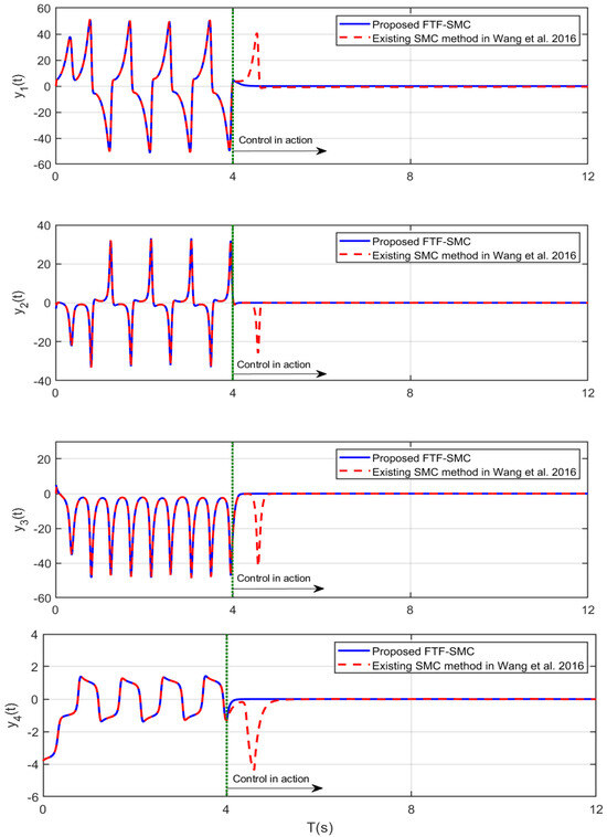 Figure 10 presents the state trajectories of system (11) when controlled by the proposed FTF-SMC (30), as well as the SMC method (55) discussed in [54]. Additionally, the green line indicates that the controller operates at sec. Both control strategies successfully drive the system’s states to converge to the origin. However, a closer examination of the trajectories reveals that the proposed FTF-SMC achieves a more rapid and robust convergence compared to the traditional SMC method (55). This enhanced performance not only indicates a faster stabilization process but also suggests improved overall system behavior under the FTF-SMC strategy, making it a more effective solution for managing the dynamics of the system.