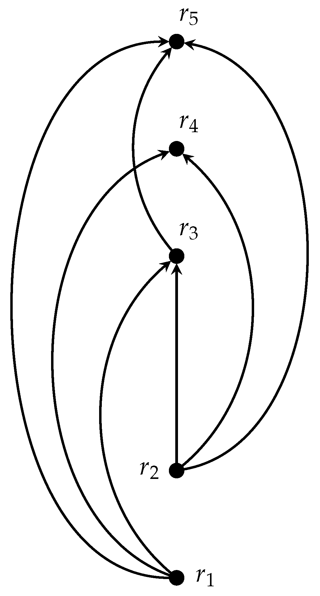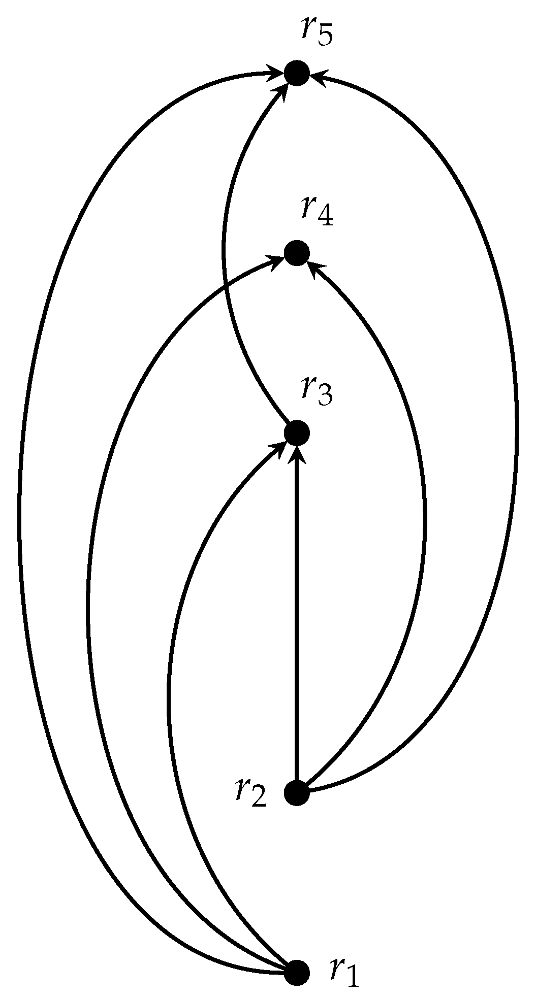 . Let be a set of possible worlds, let K be a theory such that , and let φ be a sentence of such that . Moreover, let ⊏ denote the semiorder over V depicted in Figure 1 of Section 4, and reproduced in Figure 4 for convenience. Recall that , , and .Let ⋄ be an update function satisfying postulates –, – and , which assigns at and two semiorders , , respectively, both over , and each faithful to its corresponding world. Assume further that and ⊏ coincide on their subdomains , and likewise and ⊏ coincide on their subdomains . Under these assumptions, it is straightforward to verify that . Observe that the φ-world is not contained in and , since , and thus and . Consequently, we derive from condition (S⋄) that