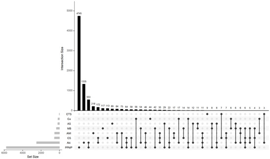 The calculated meanIR value of the complications concerned is 92.4, which shows really high imbalance. In order to comprehensively portray the spatial distribution characteristics and structural dependencies of the labels in the research dataset, this paper combines the UpSet plot and the Chord diagram as two visualisation tools to deeply analyse the imbalance and co-occurrence patterns of the labels. Figure 1 shows the intersection distribution of labels and their combinations in the dataset. This UpSet plot shows the number of elements in every possible intersection of the sets, where each bar on top represents the size of the specific intersection identified by the connected black dots below it. It can be observed that the distribution of labels is obviously unbalanced, with individual labels (e.g., “PPMP”) appearing much more frequently than other labels in the samples, and a large number of label combinations only exist in a very small number of samples, which is typical of the long-tailed distribution. The most common tag combination contains only a single tag, with a sample size of 4745, while a large number of low-frequency combinations have a sample size of less than 10, indicating that the tag combination space is highly sparse. This feature poses a challenge to multi-label classification models, especially since models based on label combination learning are prone to overfitting to high-frequency combinations while ignoring the ability to model rare labels and their joint expressions.