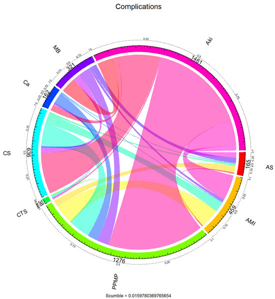 To further reveal the dependency structure between the labels, the co-occurrence relationship between the labels was visualised using a chord diagram in Figure 2. The arcs in the figure represent the marginal frequencies of each tag, and the connected bands reflect the co-occurrence intensity between tags. It can be seen that “PPMP” not only has the highest marginal frequency but also has intensive co-occurrence with multiple labels (e.g., “AKI”, “AMI”, “AS”, etc.), forming a centralised structure, suggesting that these labels may show a strong synergistic seizure pattern in clinical situations. On the other hand, labels such as “CTS” and “Ca” co-occur more in isolation or with only a small number of labels. This label co-occurrence network shows a clear hub-and-spoke pattern, where a small number of core labels are unevenly coupled with a large number of peripheral labels.
