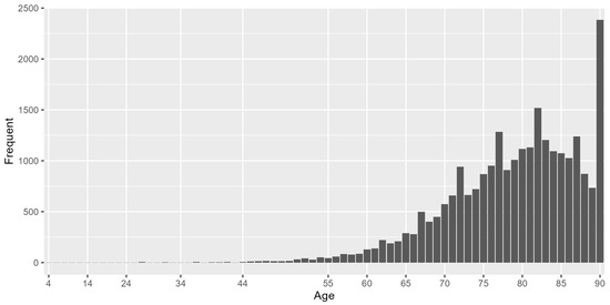 For demographic characteristics of this dataset, 56.16% were males and 43.84% were females. The minimum age of the study population was 2 years, the maximum age was 90 years and the median age was 80 years. The histogram of age distribution is shown in Figure 3, 97.4% of the sample were above 60 years old.