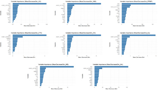 The variable importance analysis, as shown in Figure 4, intuitively reveals that the impact of different comorbidities on specific complications varies significantly. Taking dyslipidemia (Dys) as an example, it exhibits relatively high predictive importance in the placement of PPM (PPMP) and acute kidney injury (Aki), which likely correlates closely with pathophysiological mechanisms such as cardiac dysfunction caused by PPMP and fluid retention and pulmonary edema resulting from Aki. However, Dys’ importance is significantly lower in complications such as acute MI (AMI), conversion to SAVR (CTS) and cancer (Ca), indicating that its predictive value is specific. On the other hand, Implantable Prior ICD (PICD), as an indicator of cardiac interventional therapy, demonstrates some predictive utility for AMI, cardiogenic shock (CS), and Aki. However, its importance is particularly prominent in PPMP. This directly reflects the complexity and severity of cardiovascular diseases in PICD patients, increasing thus their risk of developing other cardiac-related complications. In contrast, the predictive effect of PICD on any stroke/TIA (AS) and CTS is negligible. This refined and differentiated identification of the varying effects of different comorbidities on distinct complications further underscores the necessity of employing shrinkage estimation methods in imbalanced multilabel classification tasks. This approach can precisely capture and quantify these specific associations, leading to the construction of more discriminatory, clinically relevant, and personalized predictive models.