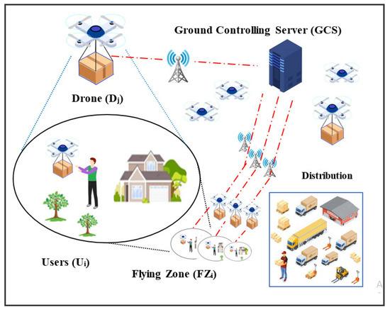 The network architecture for PSL-IoD consists of three distinct entities: (1) user (Ui), (2) ground controlling server (GCS), and (3) drone (Dj) as graphically exhibited in Figure 1. In this model, the GCS must register all users Ui and drones Dj assigned to corresponding flying zones. Although the users can normally track the status of their cargo or delivery packages in the whole supply chain process, this network model takes into consideration the last-mile delivery segment between drone and user with the help of GCS. Alternatively, the drones as a last-mile delivery option in supply chain management receive an authenticated session established with the ultimate customer/user (Ui) by creating an agreed session key SK with the assistance of GCS and deliver the packages after adopting due course of authentication procedures. The details of these entities are illustrated below.