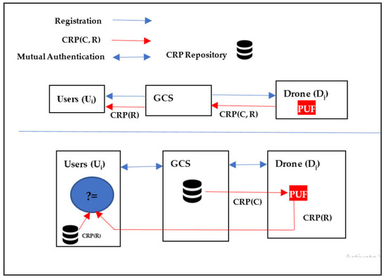 Drone (Dj): The Dj also becomes registered with GCS and receives secret credentials in return. In addition, it is embedded with the PUF circuit to ensure physical protection from tampering procedures on the part of the adversary. The drone comes into contact with the user after the mutual authentication process facilitated by GCS being online. The commonly agreed SK between user and delivery drone is used to communicate and negotiate for ultimate service. The communication framework is exhibited in Figure 2.