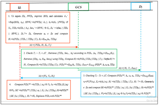 - The GCS, after receiving the authentication request, checks the freshness of T1 using T1 − Tc < ΔT. Then, it retrieves {TIDu, Secu, ku} in line with PIDu, and computes (au, TIDDj) = DSecu (Eu). Then, it retrieves {IDDj, cd, rd, SecDj} using TIDDj, and computes H1 = h(PIDu||TIDu||TIDDj||T1) to verify H1 ? = H1. If it is not true, the GCS aborts. Otherwise, it computes H2 = h(TIDu || TIDDj ||T2), PIDunew = EKG(ku, TIDu), EGCS = ESecDj (PIDunew, ku, cd, au, TIDu) and submits M2 = {H2, T2, EGCS} to Dj for further verification as displayed in Figure 5.