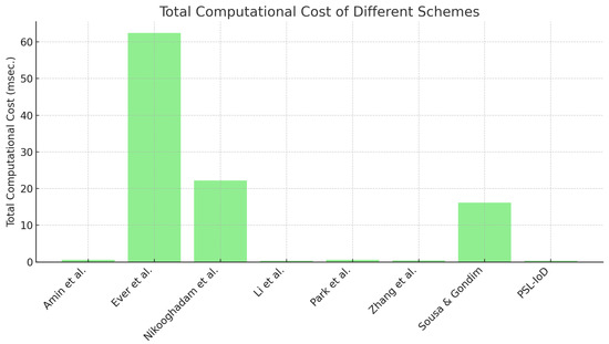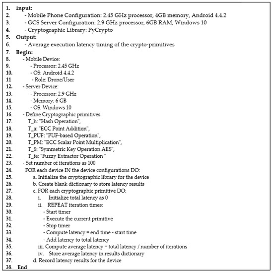The computational cost of schemes [17,19,20,27,32,33,35], [PSL-IoD] is demonstrated in Table 6. In this table, notations Th, Ta, TPUF, TPM, TS, and Tfe represent the timing latency of hash operation, point addition, PUF-based operation, ECC-oriented scalar point multiplication, symmetric key and fuzzy extractor operation, respectively. Figure 6 depicts a high-level pseudo-code for computing the timing of each operation in the experiment. We can see that schemes [17,19,20,27,32,33,35] take Tfe + 29Th, 12Th + 10TPM + 3Ta, 19Th + 4TPM, 27Th, 2Tfe + 32Th, 2TPUF + 20Th, Tfe + 3TPM + 4Ta + 12Th, and TPUF + 17Th + 5Ts, respectively. The computational latency for schemes may be computed as 0.6 ms, 62.43 ms, 22.23 ms, 0.31 ms, 0.529 ms, 0.372 ms, 16.12 ms, and 0.302 ms, respectively. It can be witnessed in Figure 7 that the computational cost and latency of PSL-IoD is less than that of the compared schemes.
