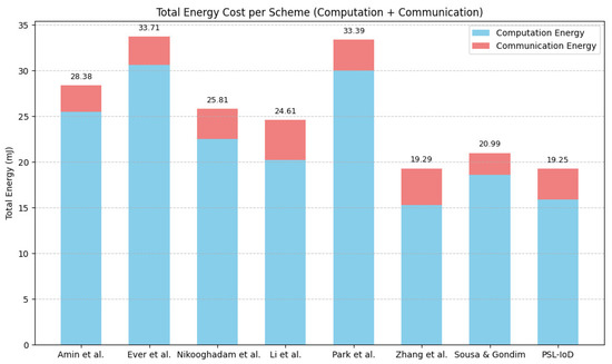For calculating communication costs of comparative protocols, we assume that the bit lengths for the exchanged crypto-primitive factors in communication messages for hash digest function, original identity, pseudo-identity, random integer, ECC operation, and timestamp are 256 bits, 160 bits, 128 bits 160 bits, 320 bits, and 32 bits, respectively. The communication cost of schemes [17,19,20,27,32,33,35], [PSL-IoD] is computed as 2176 bits, 2336 bits, 2496 bits, 3292 bits, 2560 bits, 3008 bits, 1824 bits, and 2528 bits, respectively. Our scheme requires lesser communication cost in comparison with [19,32,33]. Although schemes [17,20,27,35] take less communication overhead than PSL-IoD, these schemes are prone to many security limitations as depicted in Table 6. Figure 8 depicts total energy cost, i.e., energy consumption for computation and communication, in millijoules (mJ) by considering the estimated energy cost per byte as computed in [39,45]. It can be witnessed from this table that besides maintaining a high degree of security, PSL-IoD requires the least energy consumption for computation and communication of bytes in comparison with other related studies.