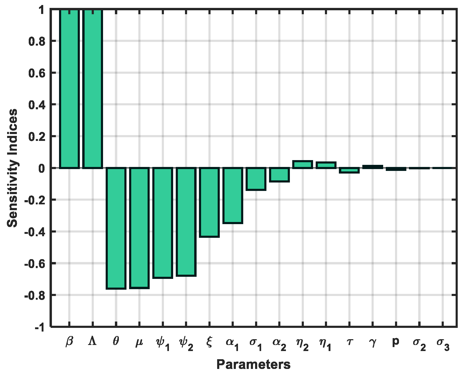 Figure 3 presents the sensitivity index values of various model parameters, calculated using expression (34) and arranged in descending order from the most sensitive to the least sensitive (left to right). An absolute value of the sensitive index greater than 0.5 is considered to have a significant effect on