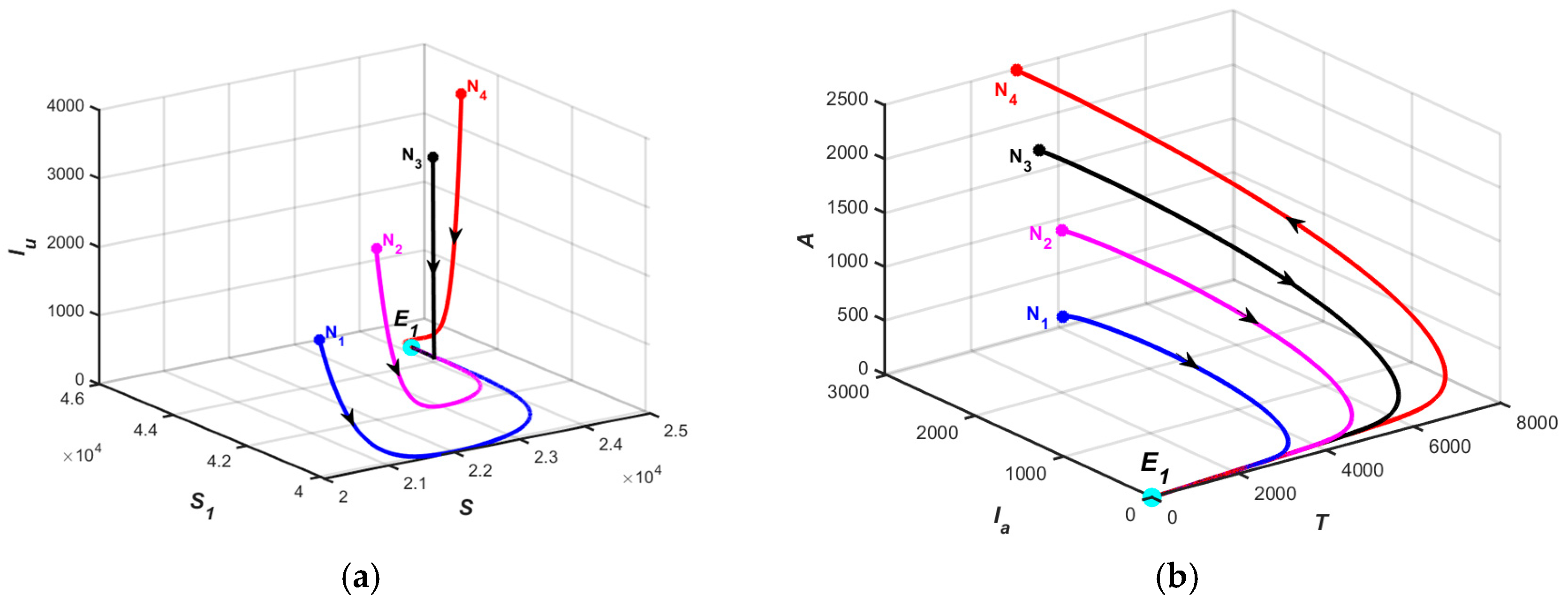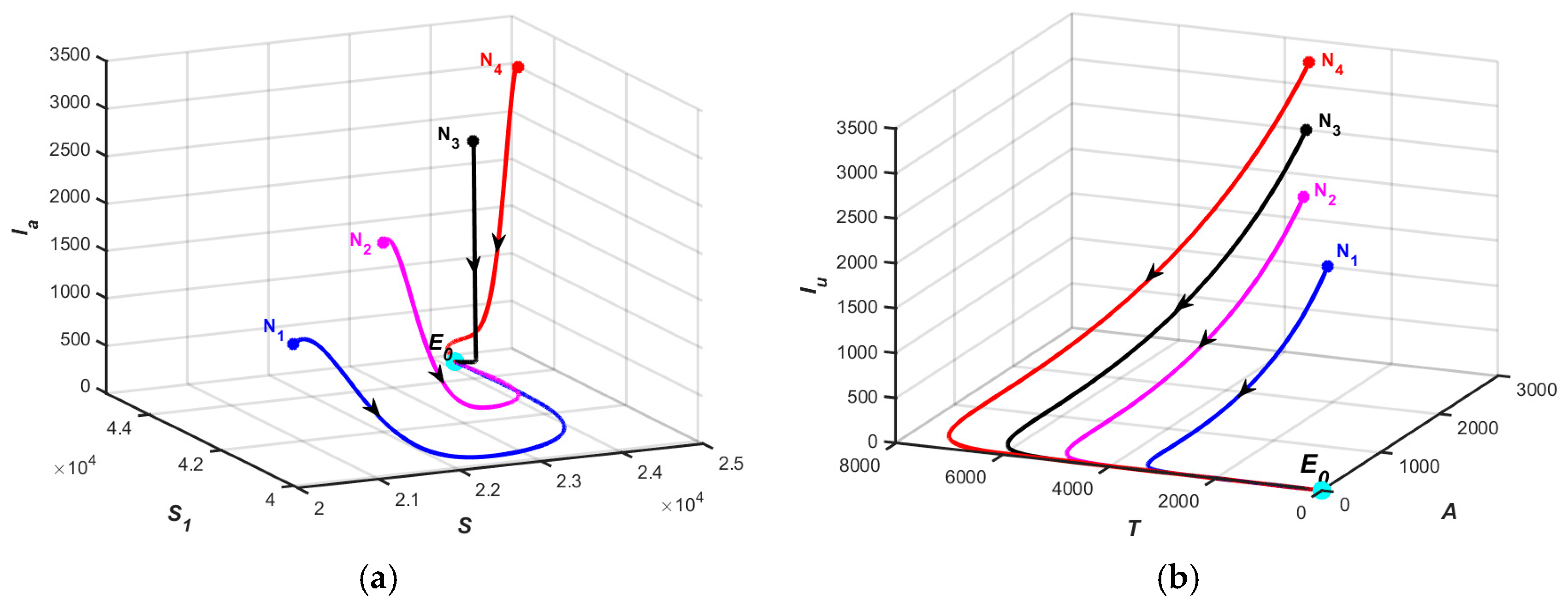 It is important to highlight that the coefficient is always positive due to . Consequently, the local dynamics around the disease-free equilibrium point are determined by the sign of the coefficient . Since and it is clear that Hence, model (8) undergoes a forward bifurcation at . Thus, the proof of Theorem 4 is completed.