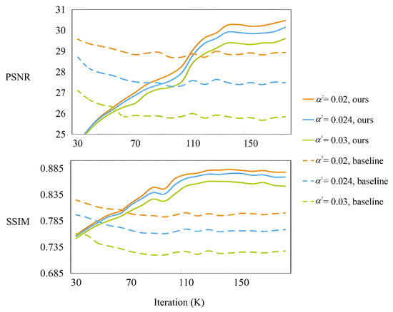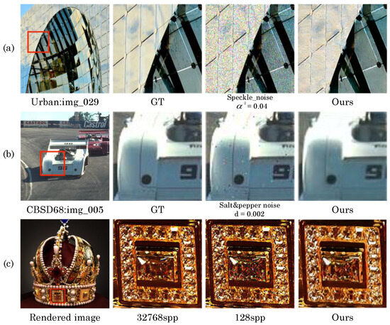 where denotes the denoised image, I is the clean ground-truth image, and H, W, and C represent the height, width, and channel number ( 3 for RGB), respectively. This formulation ensures pixel-wise consistency and aligns with PSNR and SSIM, which are sensitive to pixel intensity differences. The Adam optimizer [42] is set to and to minimize pixel loss. Additionally, we set the learning rate to and the batch size to 8. Because the model is trained with Gaussian noise, we evaluate the generalization performance of the model on three other synthetic noises, including salt-and-pepper noise, speckle noise, and Monte Carlo (MC)-rendered image noise.