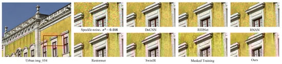 Speckles noise is a type of noise that is generated during the acquisition of medical images or tomography images. We employ different variances to generate different levels of noise. Multiplicative noise is added following the equation , where is uniformly distributed random noise with mean 0 and variance , and represents the noisy image. We validate the superiority of our denoising model for speckle noise on the CBSD68 [43] and Urban100 [42] datasets, and the experimental results are presented in Table 1 and Figure 3. Table 1 shows that DMET achieves 29.68 PSNR ( = 0.03) and 28.99 PSNR ( = 0.04) on the CBSD68 dataset, outperforming the masked training baseline by +0.19 dB and +0.46 dB, respectively. This improvement is attributed to the texture-guided adaptive masking, which preserves fine details in texture-rich regions (e.g., fabric patterns) while enforcing semantic recovery in smooth areas (e.g., sky regions). Although speckle noise is typically associated with domains such as medical imaging or synthetic aperture radar (SAR), in this study we apply it to natural-scene images to evaluate the cross-domain generalization capacity of DMET to multiplicative distortions. As shown in Figure 3, the model still demonstrates strong denoising performance for the example building image outside of its original domain, which further indicates the robust generalization ability of our model. To assess model performance across a wider range of multiplicative noise, we additionally tested = 0.024 and 0.02, as shown in Figure 4. DMET maintains strong denoising performance and exhibits stability across varying noise intensities.