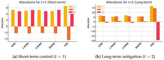 Rationale for the five-fold numerical protocol. Each of the five numerical experiments serves as a deliberately structured “stress-test” for one dimension of the allocating problem. The UMIE provides a pure-equity baseline in which no ex-ante priorities are imposed; The 1-WMIE switches on agent-level weights to test how institutional asymmetries propagate; The 2-WMIE instead activates strategy-level weights to reveal the impact of technological heterogeneity; The BWMIE combines both layers to gauge joint equity–efficiency tensions; and the IMIE finally replaces exogenous weights with endogenous marginal effects, checking whether the model can adapt when empirical performance data dominate. Comparing these five outputs under identical inputs, therefore, allows us to isolate how each weighting assumption reshapes the allocation vector, and to verify that the proposed framework behaves consistently across the full spectrum from egalitarian to priority-driven situations.