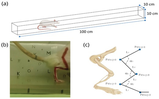 (a) Scheme of the tunnel system, which the rat traverses, used to acquire the video footage; (b) frame (RBG image) extracted from the video, where the red marks (in its limbs) can be observed; (c) geometric representation of the biomechanical components in the back leg of the rat.
