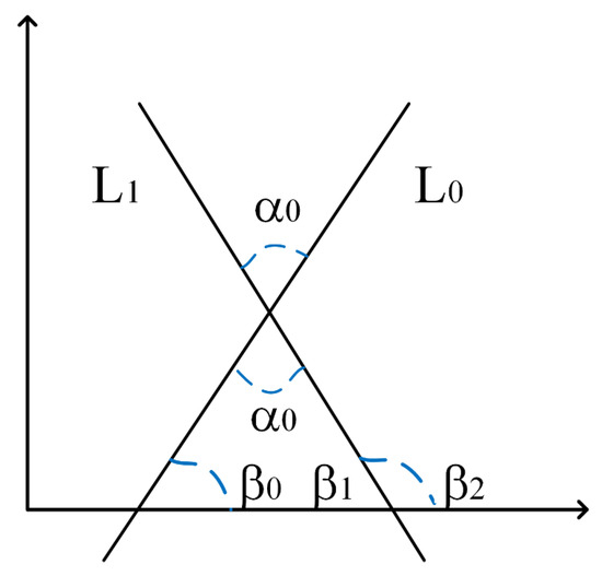 Observing Figure 1b,c, the angles formed between the lines are an important element in the dynamic of rat movements, making their measurement a necessity. To determine the angle between two straight lines, the geometry of Figure 2 is analyzed where the and lines are extended until they intersect in a coordinate system, forming the , and angles.
