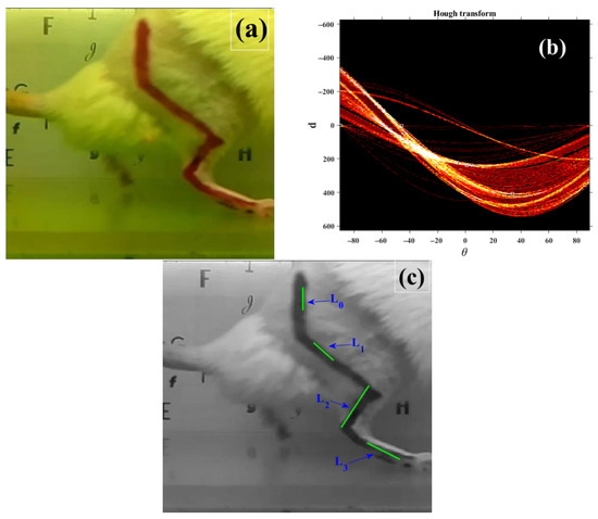 Figure 1 illustrates the system required for locomotion measurement in rats. In Figure 1, the rat is presented traversing through a transparent tunnel; throughout the trajectory, a video of its movement is acquired. Figure 1b displays a frame (digital image) of the rat’s rear; it can be observed that red lines were traced in one of its limbs beforehand. Lastly, Figure 1c, shows the geometry employed to analyze the rat’s locomotion. To localize lines within a Hough transform space, the following steps must be implemented: (a) an RGB image is acquired from a video with a size of pixels; (b) the RGB image is transformed into a grayscale image where every pixel has a value within an interval of 0 to 255; (c) a global threshold is applied to the image to obtain the binary image where every pixel has a value of zero (black pixel) or one (white pixel); (d) the Hough transform of the image is then calculated applying