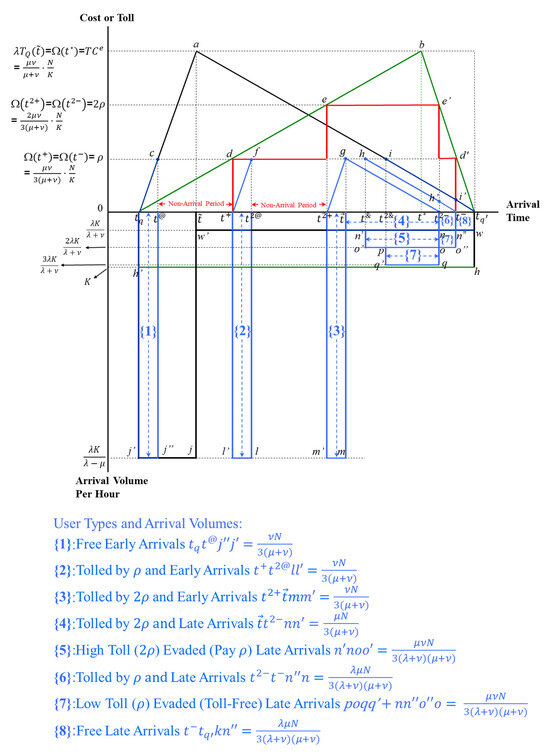 The above results regarding the user types and their arrival volumes can be analyzed based on the lower part of the horizontal axis in Figure 5. User types {1}−{3} and {4}−{8} represent users who arrive early and late, respectively, at the bottleneck entrance. Their arrival areas are distributed within their respective blue rectangular blocks. According to Figure 5, since , , and overlap or are parallel with , the hourly arrival volume () for the periods (), () and () is the same as that during the early arrival period () before toll implementation. Additionally, since no users arrive during the periods () and (), the hourly arrival volume for each period is zero, and no blue blocks exist for these two periods.