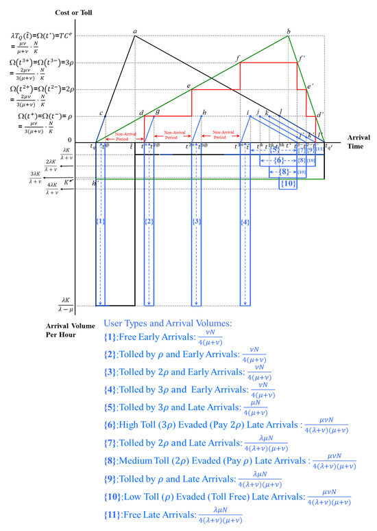 As shown in Figure 6 and Table 7, the user types after the implementation of the optimal three-step toll scheme can be categorized into eleven types: {1} toll-free and arriving early, {2} paying a low toll () and arriving early, {3} paying a medium toll () and arriving early, {4} paying a high toll () and arriving early, {5} paying a high toll and arriving late, {6} avoiding high toll (paying medium toll) and arriving late, {7} paying a medium toll and arriving late, {8} avoiding medium toll (paying low toll) and arriving late, {9} paying a low toll and arriving late, {10} avoiding low toll (unwilling to pay) and arriving late, and {11} toll-free and arriving late.