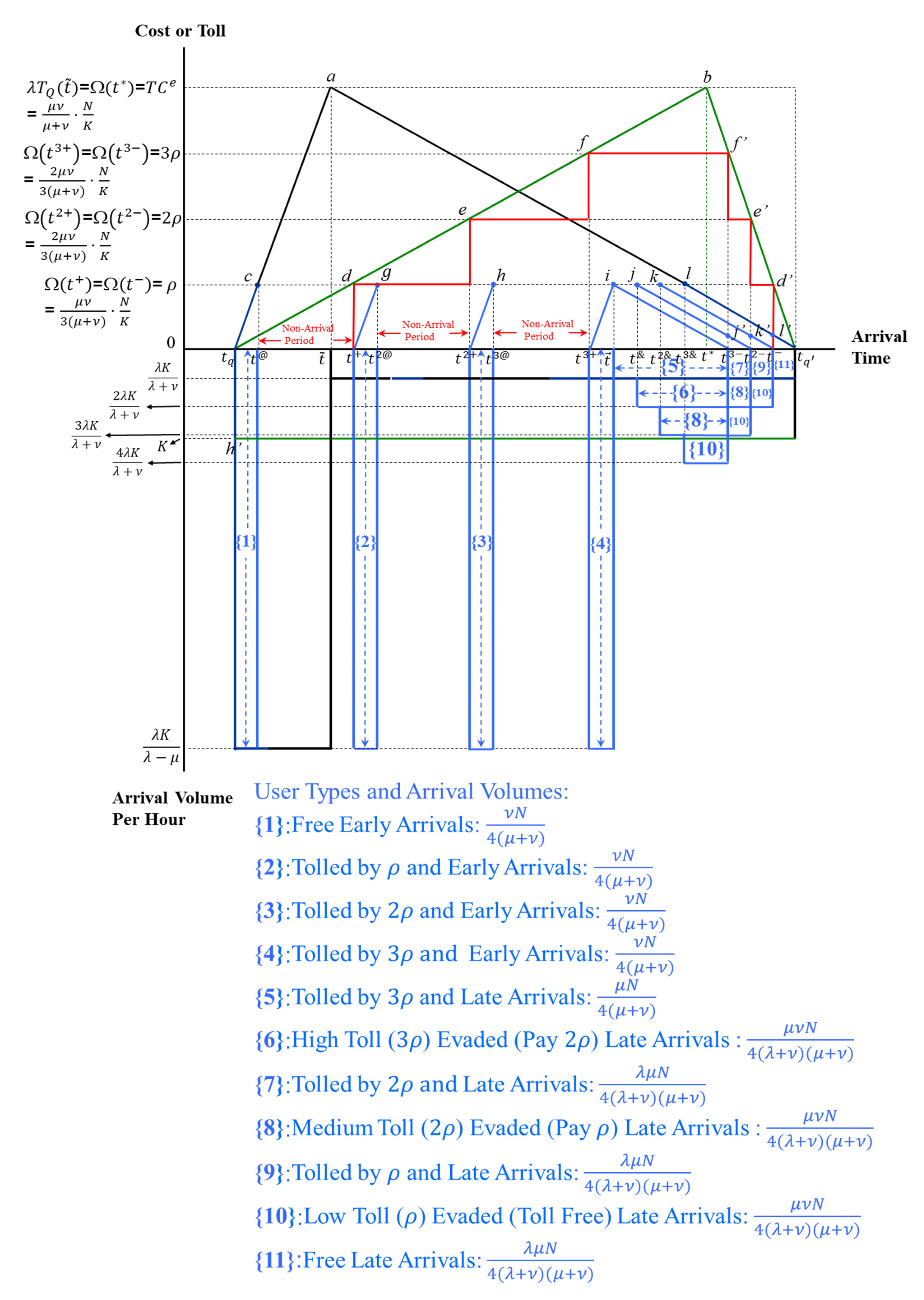 Notably, during the arrival period (), in addition to the tolled users, there is also a group of users, with a total of , who queue sequentially near the bottleneck entrance and enter after the end time of the toll (. Since of these toll-evading users overlaps with , their hourly arrival volume is also , making the hourly arrival volume during the period () increase to . Moreover, since overlaps with , the hourly arrival volume of toll-free users during the interval () is the same as the late arrival period () before the toll implementation.