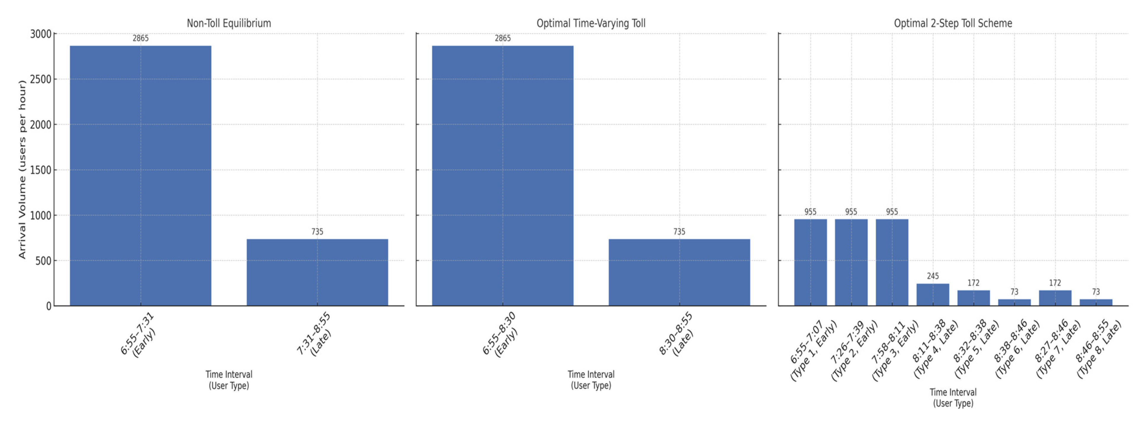 Figure 4, the total arrivals and the distribution of arrival times for each user type after the toll implementation can be easily observed. The arrival periods of early users {1} and {2} are closely adjacent to the time period with no arrivals (