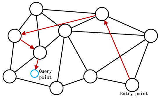 The NSW structure is specifically designed to possess small-world network characteristics, meaning that any two nodes in the graph are typically connected by a short path. This property ensures efficient local search operations, allowing neighboring nodes to be identified effectively. Moreover, the NSW incorporates long-range connections between nodes, significantly enhancing navigation efficiency. During ANN search, this facilitates rapid traversal across the graph to locate potential candidates. In Figure 1, the arrows illustrate an example path obtained via a greedy algorithm from an entry point to a query point.