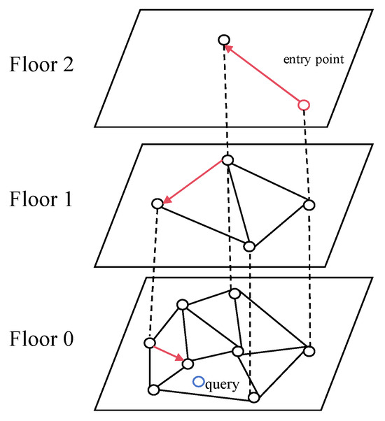 The HNSW algorithm organizes connections into distinct hierarchical levels based on their lengths, enabling efficient multi-layer graph traversal. This hierarchical architecture ensures that each node maintains a constant number of connections, independent of the overall network size. As depicted in Figure 3, the search process initiates from the topmost layer containing only the longest-range connections.