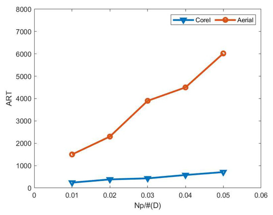 Figure 8 demonstrates that the ratio gradually decreases with increasing M, indicating that supplementing additional neighbor points effectively compensates for the accuracy limitations inherent in using a single hash function. However, as M continues to increase, the ratio eventually stabilizes, suggesting that sufficient neighbor points have been incorporated and further additions provide no additional performance benefits while unnecessarily increasing storage overhead. Figure 9 presents the variation in ART. The ART primarily depends on the size of the final query set, which was maintained at approximately 3% of the original dataset size in these experiments, resulting in generally stable query times. Nevertheless, higher-dimensional and larger-scale datasets require longer processing times. Consequently, the per-query time cost is significantly greater for the 60-dimensional AerialD dataset compared to the 32-dimensional Corel dataset.
