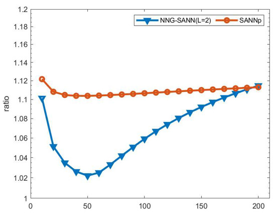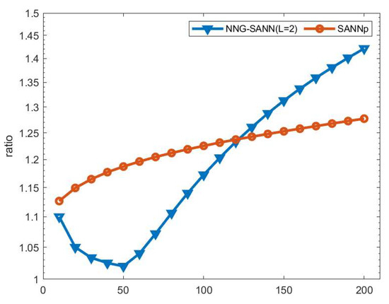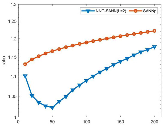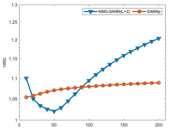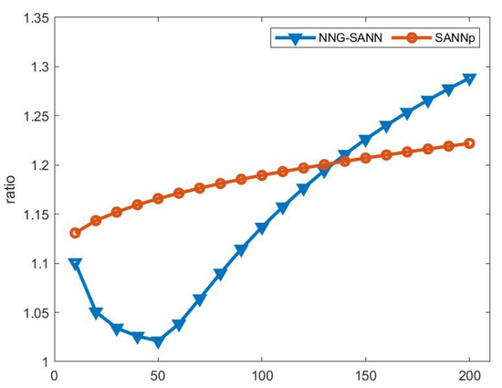 The ratio on the Sift dataset with NNG-SANN (where the L set to 2) and SANNp.