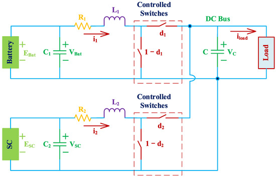 where and are the battery side and supercapacitor side inductors; and are the battery side and supercapacitor side inductor currents; and are the series resistances of and ; and are the battery side and supercapacitor side filter capacitors; C is the DC bus capacitor; VBat is the battery terminal voltage; is the supercapacitor terminal voltage; is the relevant DC bus capacitor voltage; and and are the duty cycle of switches.