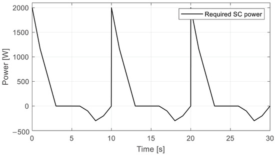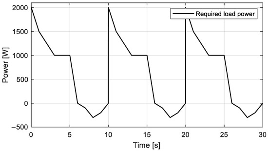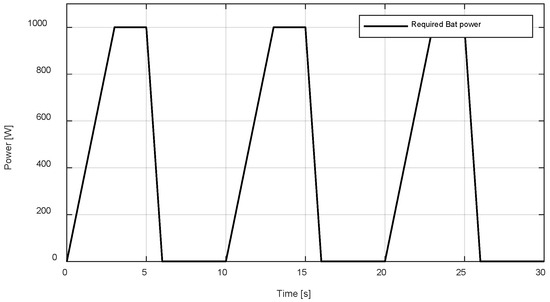 This section evaluates the efficacy of the proposed approach in the HESS by performing a study using the MATLAB(R2021b)/Simulink platform. Table 1 and Table 2 display the HESS parameters and the control and modulation gains. Figure 4, Figure 5 and Figure 6 illustrate the required power profiles for the load, battery, and supercapacitor: