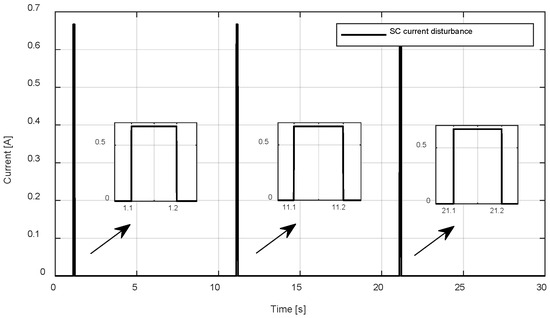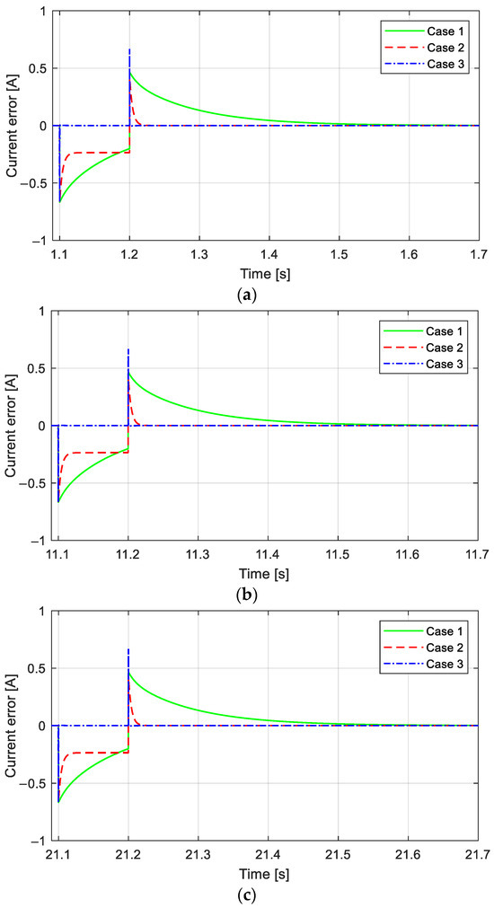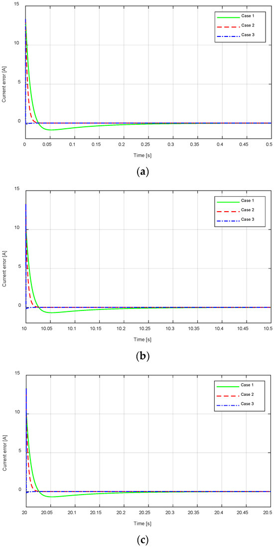 An enlarged view of the supercapacitor’s current tracking error performance, : (a) zoom in along the x-axis at 0 s; (b) zoom in along the x-axis at 10 s; and (c) zoom in along the x-axis at 20 s.