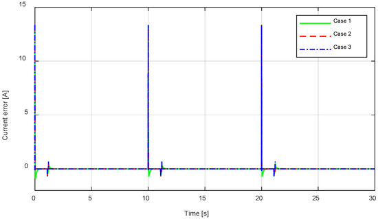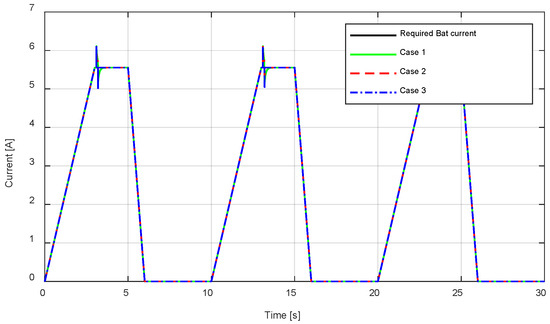 We start by examining the performance of the battery’s current tracking. As seen by the battery’s required load power profile in Figure 5, the battery only takes part in the discharge process, and between 3 s and 5 s, the discharge power progressively rises to the maximum requirement of 1000 W. After 5 s of each cycle, the battery will begin to take part in the discharge process, which will lower its power from 1000 W to 0. Figure 9 and Figure 10 show the battery’s current tracking performance. The effects of the measurement disturbance in Figure 7 can be lessened by the current tracking errors of cases 1, 2, and 3. However, as Figure 11a for cycle 1, Figure 11b for cycle 2, and Figure 11c for cycle 3 demonstrate, the current tracking errors of cases 1 and 2 never converge to zero during the time intervals from 3.1 s to 3.2 s, 13.1 s to 13.2 s, and 23.1 s to 23.2 s for three cycles. The current tracking errors of the battery discharge process in case 3 converge faster than those in cases 1 and 2 after being affected by the measurement disturbance because the H∞ norm in (10) always guarantees that the efficiency of H∞ control and the advantage of the suggested reference modulation technique of the required current, derived from the required Bat power, are applied. Furthermore, the large fixed controller gains of the classical PI control strategy used in case 1 make it evident that the transient response of case 1 is inferior to that of cases 2 and 3.