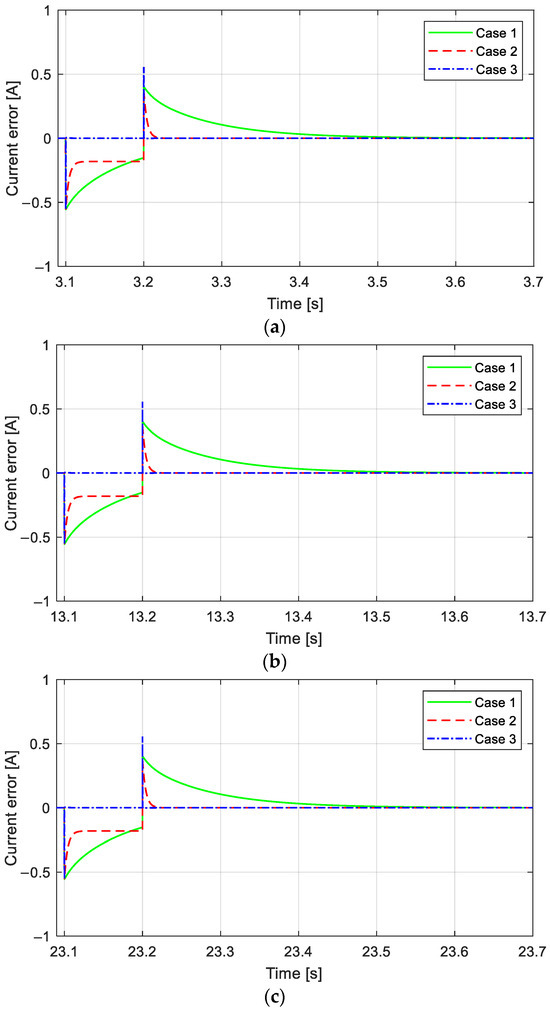 An enlarged view of the battery’s current tracking error performance : (a) zoom in along the x-axis from 3.1 s to 3.7 s; (b) zoom in along the x-axis from 13.1 s to 13.7 s; and (c) zoom in along the x-axis from 23.1 s to 23.7 s.