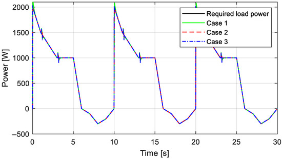Finally, to assess how well the suggested approach controls the battery and supercapacitor current to provide the required load power, Figure 16 and Figure 17 display the power tracking performance results. Under the measurement disturbance shown in Figure 7 and Figure 8, the power tracking performance during the charge and discharge processes is enhanced in both scenarios 1, 2, and 3. However, as Figure 18a–c demonstrate, the power tracking errors of cases 1 and 2 under the influence of measurement disturbances on the battery and supercapacitor currents during all three cycles are unable to converge to zero, whereas the current tracking errors of case 3 rapidly do so. More specifically, in case 2, under the influence of measurement disturbances on battery and supercapacitor currents, the power tracking errors from 3.1 s to 3.2 s, from 13.1 s to 13.2 s, and from 23.1 s to 23.2 s are 32.5 W, and from 1.1 s to 1.2 s, from 11.1 s to 11.2 s, and from 21.1 s to 21.2 s are 35.3 W in all three cycles. Meanwhile, in case 1, the power tracking errors are greater than 32.5 W and 35.3 W during the disturbance-affected periods. Furthermore, at the beginning of each cycle and during times when measurement disturbances affect the battery and supercapacitor currents, the convergence time performance in case 3 is likewise faster than that in cases 1 and 2, as shown in Figure 18a–c and Figure 19a–c. The rate of change (ROC) for cases 1 and 3 is −98.57% after 0 s and −49.93% after 1.2 s and 3.2 s, according to Table 3 for cycle 1 for further analysis. In contrast, the ROC for cases 2 and 3 is −80% after 0 s and −8.95% after 1.2 s and 3.2 s. According to these ROC results, the proposed strategy in case 3 converges more quickly than the classical PI control method in case 1 and the H∞ control in case 2. Furthermore, it is evident that case 2’s rate of convergence is faster than case 1’s when comparing the ROCs of cases 1 and 2 with case 3. A similar methodology is used to analyze the rate of convergence in cycles 2 and 3. We verify that the proposed control approach has effectively improved power tracking performance to satisfy the required load power for the variable load while being affected by measurement disturbance in practical applications; this is because, in case 3, the effectiveness of H∞ control is always guaranteed by the H∞ norm in (10). In particular, the advantage of the proposed reference modulation technique in case 3 is that it attenuates disturbances without requiring the design of a disturbance observer. The traditional approach, which only employs traditional H∞ control in case 2 and classical PI control in case 1, differs significantly from case 3’s disturbance attenuation without a disturbance observer.