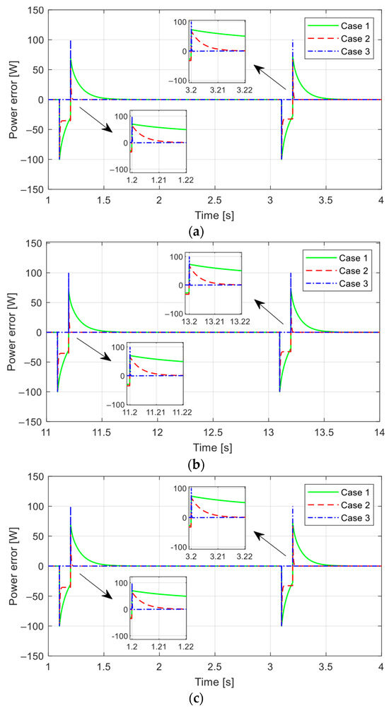 An enlarged view of the power tracking error performance: (a) zoom in power tracking errors along the x-axis from 1 s to 4 s; (b) zoom in power tracking errors along the x-axis from 11 s to 14 s; and (c) zoom in power tracking errors along the x-axis from 21 s to 24 s.