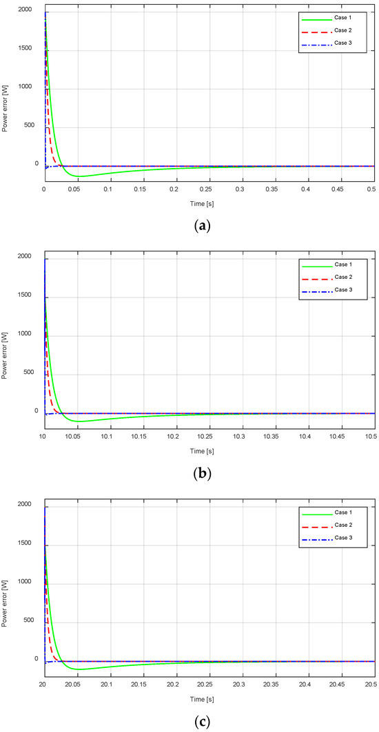 An enlarged view of the power tracking error performance: (a) zoom in power tracking errors along the x-axis at 0 s; (b) zoom in power tracking errors along the x-axis at 10 s; and (c) zoom in power tracking errors along the x-axis at 20 s.
