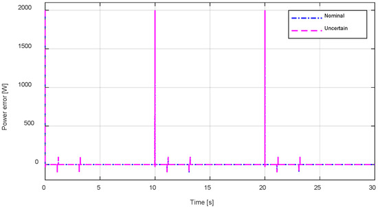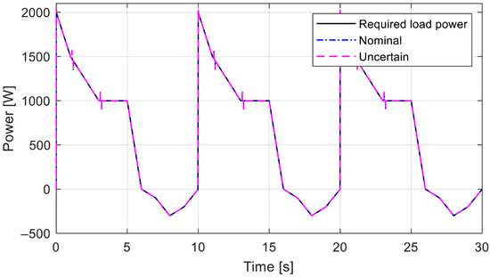 Figure 20 and Figure 21 display the current tracking performance of the battery and the supercapacitor results compared to the nominal parameter results. In case 2 of the suggested method, we observe that the amplitude and setting time of the current tracking errors in Figure 22 and Figure 23 are similar to the nominal parameter results. Thus, in the case of parameter uncertainties, the current tracking performance of the battery and the supercapacitor in Figure 20 and Figure 22 is guaranteed. This results in the outcomes illustrated in Figure 24 and Figure 25, which indicate that the power tracking performance of the HESS is also guaranteed and satisfies the power requirement of the continuously varying load in practical applications. Because the H∞ norm in (10) always guarantees the H∞ control based on the recommended reference modulation technique for required currents, we conclude that the suggested method is robust against measurement disturbances and parameter uncertainties.