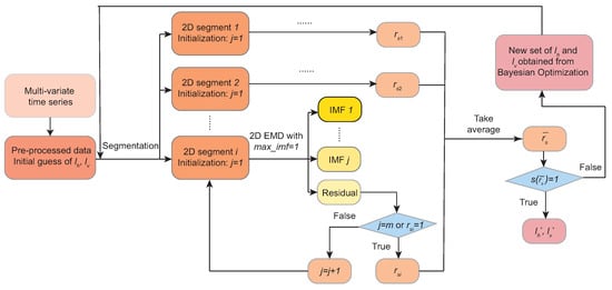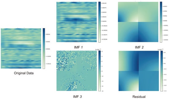 - An interpretable and low-complexity front-end for decomposing multivariate time series is proposed. The front-end captures the spatial–temporal inter-dependencies within the 2D data symbols without requiring complex multi-dimensional or deep learning methods for extracting relevant features. The front-end is followed by a bank of interpretable univariate (single-channel) predictors. The equal-sized segments avoid the need for optimizing the size of each 2D segment separately. In addition, 2D EMD with bivariate spline interpolations instead of the previously assumed 1D EMD is employed for extracting the spatial–temporal IMF components.