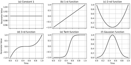 Six different basis functions were used in the simulation study over the time interval . To ensure meaningful variation, the time variable t was scaled by a fixed constant in certain functions: specifically, t was multiplied by 5 in the Tanh function and by 2 in the Gaussian function. For the first, second, and third order basis functions, the time axis was first shifted by 0.5 and then scaled by a factor of 2 in the positive direction.