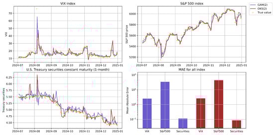 The results show that both GAM and OKS perform well, achieving low MAEs across all three indices, although GAM exhibits slightly more fluctuation than OKS in predicting U.S. Treasury securities. Additionally, the findings suggest that when the VIX is high, U.S. Treasury securities tend to decline the following day. This aligns with expectations, as high market volatility often drives investors toward safe-haven assets, such as Treasury bonds, which in turn affects yields. Conversely, when the VIX decreases, investors tend to reallocate capital into equities such as the S&P 500, leading to reduced demand for Treasuries. Finally, the relationship between the VIX and the S&P 500 also holds: when the VIX is elevated, the S&P 500 typically declines or exhibits only modest gains, consistent with established market behavior.