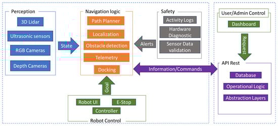 Figure 2 provides an overview of the software architecture that enables autonomy in the Panthera robot. The robot operates on the Robot Operating System (ROS) and features a main navigation system that updates its state using data from perception and computer vision sensors. An integrated alert system monitors software integrity and logs operational data for debugging purposes. The architecture also includes a cloud-based system to support monitoring and control by the operator, along with a remote control pad that allows manual override in case of emergencies.