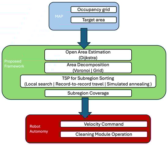 Subsequently, the resulting subregions are optimized and ordered to minimize the overall traversal distance, thereby enhancing operational efficiency. To determine the optimal visiting sequence of subregions, the problem is formulated as a TSP, and multiple optimization heuristics are evaluated, including local search, record-to-record travel, and simulated annealing. Coverage paths for each subregion are generated asynchronously, enabling the robot to commence cleaning tasks while remaining paths are computed concurrently in the background. Furthermore, the framework incorporates integrated control of the robot’s cleaning mechanisms, ensuring seamless and efficient task execution within the defined operational workflow.