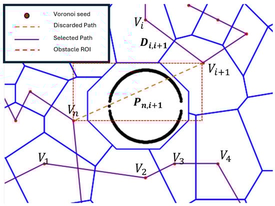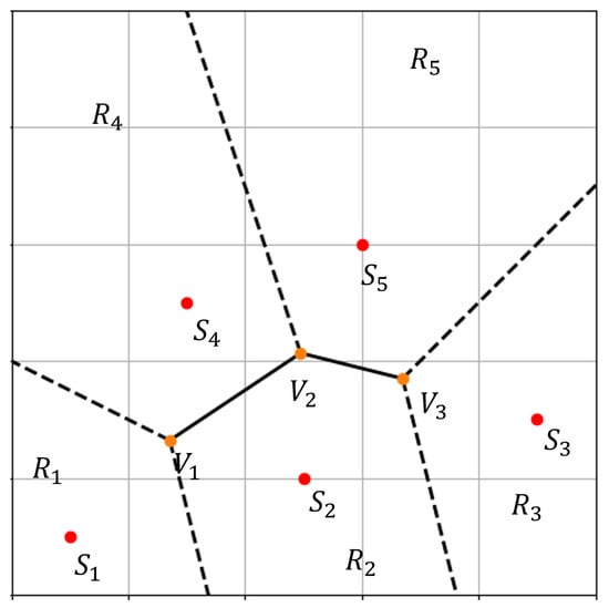 Figure 6 is used to explain this process considering a Voronoi-based decomposition, where represents the Voronoi vertices. The Euclidean distance between the subregion and the subregion uses (1), where and denote the coordinates of the exit point of the subregion and the entry point of the subregion, respectively.