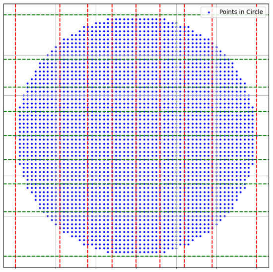 The grid-based decomposition is given in Algorithm 4. The grid splitting method begins by generating a mesh grid of points derived from the open area identified through Dijkstra exploration (interpreted as the Cartesian product of the traversable space). It then organizes the X and Y coordinates and divides them into equally sized segments of a minimum size of four times the robot’s footprint to determine each subregion’s minimum and maximum bounds. Figure 5 illustrates the identified open areas within a circular map (shown in blue), while red and green dashed lines indicate the vertical and horizontal subdivisions, respectively, offering a clear and structured visualization of the segmented circular domain. The grid approach takes the total free area and fits the grid inside, prioritizing discretization. For large and heavy robots, the grid-splitting algorithm ensures a safe distance from obstacles and prevents unnecessary maneuvers. This approach is particularly beneficial for such robots, as it maintains a uniform distance from obstacles, providing wider safety margins and enabling more predictable, straight-line paths, which reduces the risk of collision and instability during turns.