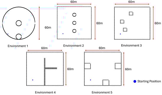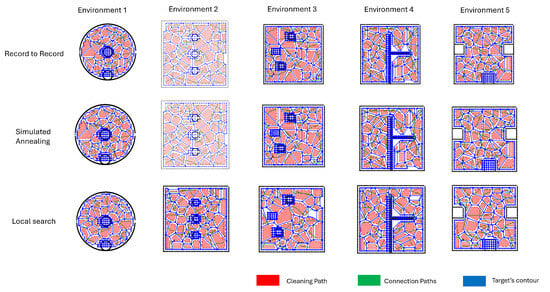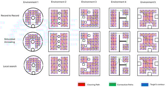 Five different environments with diverse characteristics were selected for the simulations (see Figure 8). Area coverage, computation time, and path distance were considered the performance metrics. The performance of the CPP variants of the proposed framework is given in Table 1 and Table 2, Figure 9, Figure 10, and Figure 11, respectively. The coverage paths achieved by Voronoi-based decomposition using local search, record-to-record travel, and simulated annealing for TSP are shown in Figure 12. The coverage paths achieved by grid-based decomposition using local search, record-to-record travel, and simulated annealing for TSP are shown in Figure 13.